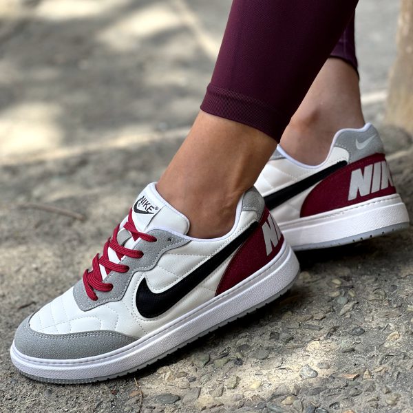 لوگوی سیاه نایک روی بدنه، جلوه خاص و متمایزی به کفش داده و بندهای سفید مرتب، فیت خوبی روی پا ایجاد میکنند.